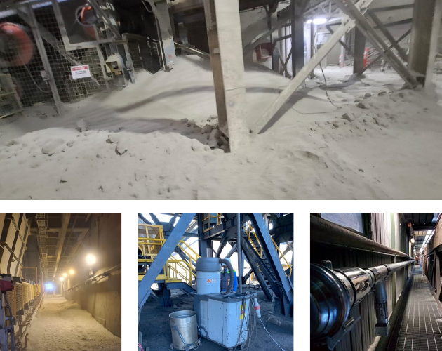 En procesos como chancadores primarios y secundarios nos encontraremos con correas transportadoras que conducen el material aguas abajo, este proceso es alto en finos que se acumulas en los túneles donde funcionan las correas transportadoras.