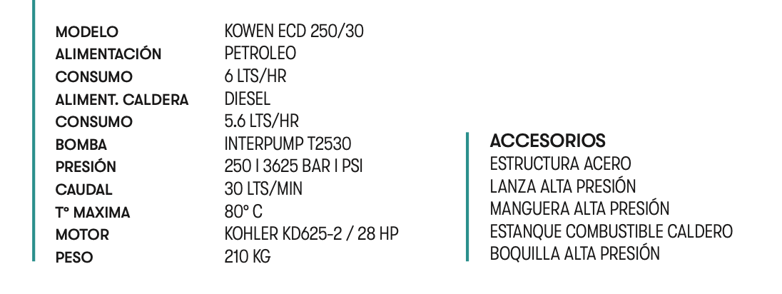 Cuenta con un motor KOHLER KD625-2 con una potencia de 28 HP y una bomba de alta presión Interpump T2530 capaz de generar 250 BAR de presión con un caudal de 30 lt/min.Su componente de alta temperatura llega fácilmente a los 80°C gracias a su caldera a base de petróleo, compuesta por un serpentín de acero mannesmann. Este conjunto nos brinda una garantía de seguridad y calidad a toda prueba frente a tareas exigentes. Sin duda esta unidad hará más eficientes sus actividades de limpieza y mantención.