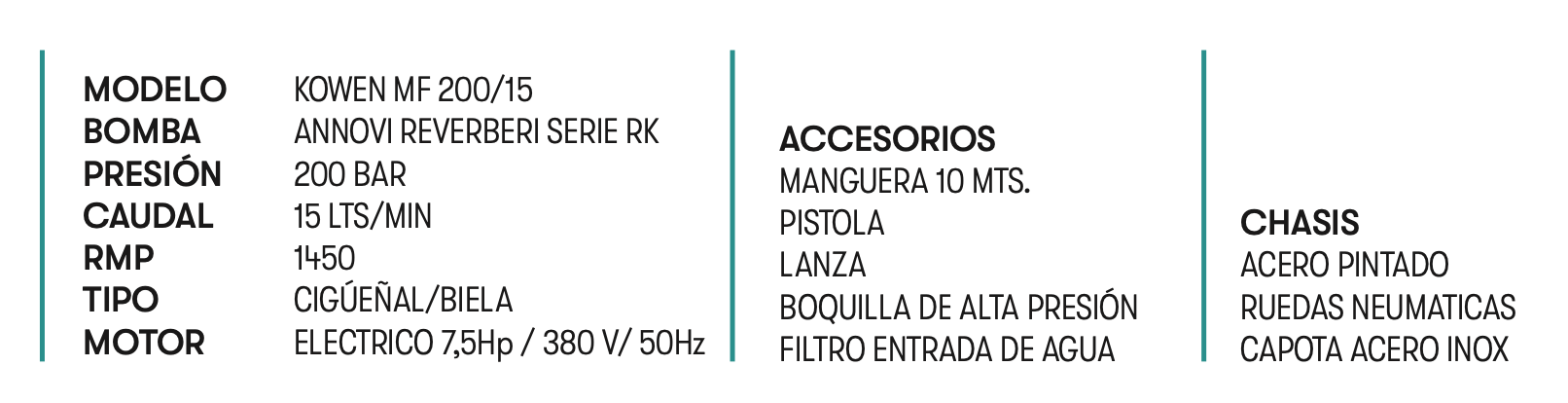 Estructura metálica, capota acero inoxidable, conjunto motor-bomba de 1450 rpm.